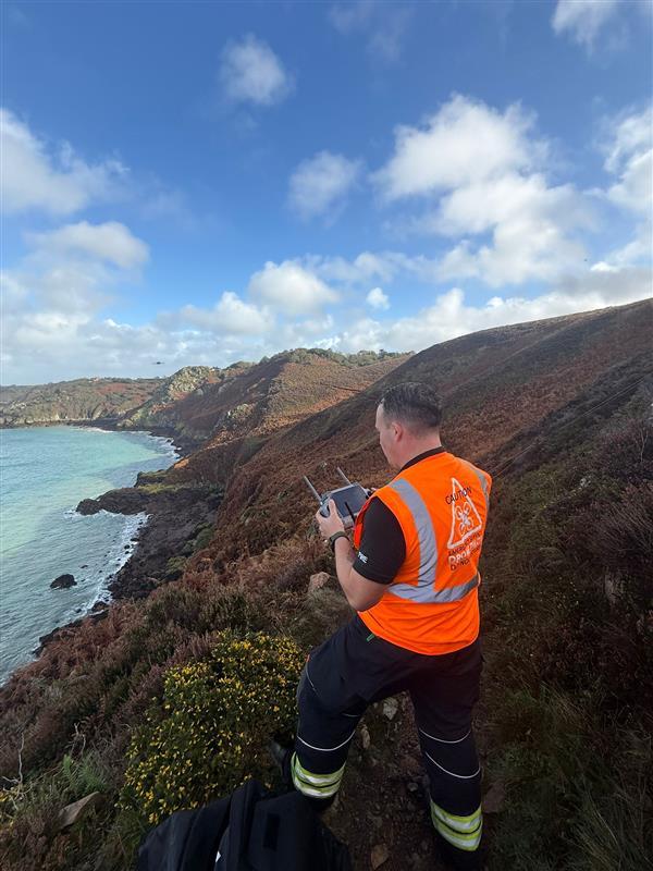 During his walk, George took a tumble off the cliff path and landed on a ledge 15 meters below. His exact location was unknown, so our drone team searched the area and spotted him safe but stuck.